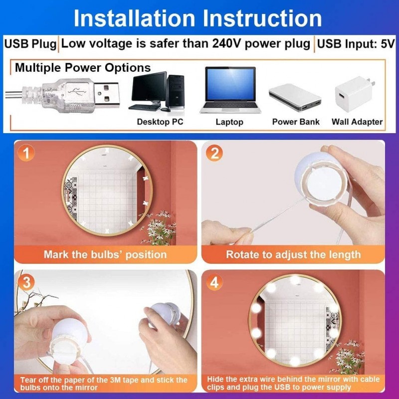 تركيبها سهل للغاية مع الشريط اللاصق المزدوج الجوانب المرفق الذي يثبت الأضواء بأمان حول مرآتك أو طاولة الزينة. تضمن ميزة الطاقة عبر USB أنه يمكنك توصيلها بسهولة بأي شاحن USB أو لابتوب، مما يجعلها مثالية للاستخدام المنزلي والسفر.