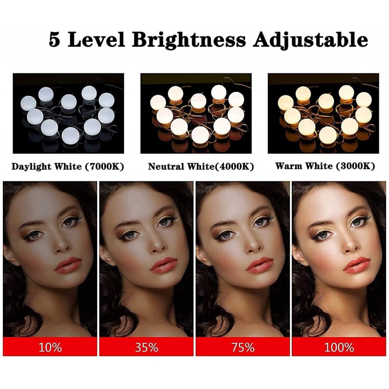 تتميز المجموعة بـ 10 لمبات LED التي تصدر إضاءة ساطعة ولكن ناعمة، مما يحاكي إضاءة هوليوود الرائعة. يمكنك الاختيار من بين ثلاث درجات حرارة لونية مميزة: الأبيض البارد للدقة، والأبيض الدافئ لتوهج طبيعي، والأبيض الناعم لخلق جو مريح. تتيح لك هذه المرونة تخصيص إضائتك بناءً على احتياجاتك وتفضيلاتك.