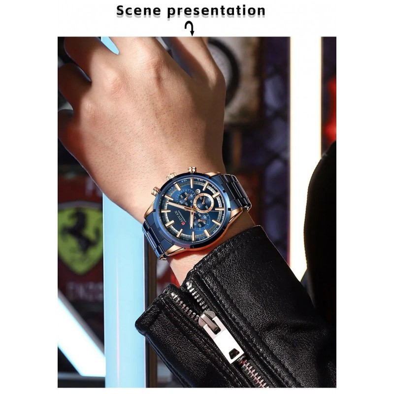 تُكمل القرص الأزرق الداكن علامات الساعات الكبيرة ذات اللون الوردي الذهبي التي تعزز الرؤية وتضيف إلى جاذبيتها الرياضية. مع ثلاثة أقراص فرعية للكرونوغراف موضوعة عند الساعة 3 و6 و9، تقدم هذه الساعة وظائف توقيت دقيقة أساسية لعشاق الرياضة. التصميم المميز لعقرب الثواني المركزي يرفع من جاذبيتها الحديثة.