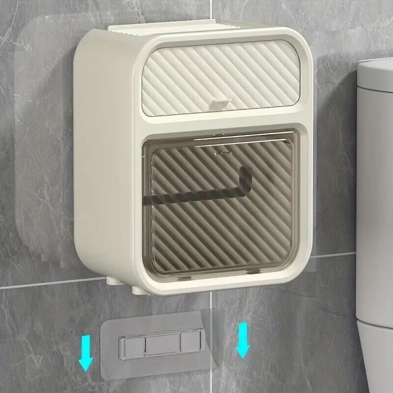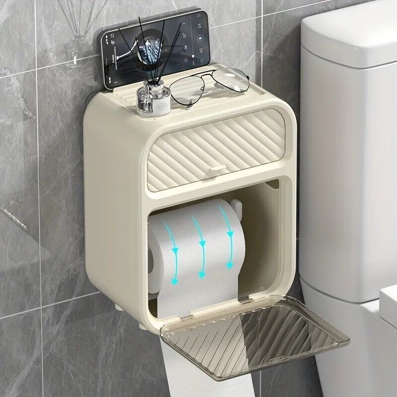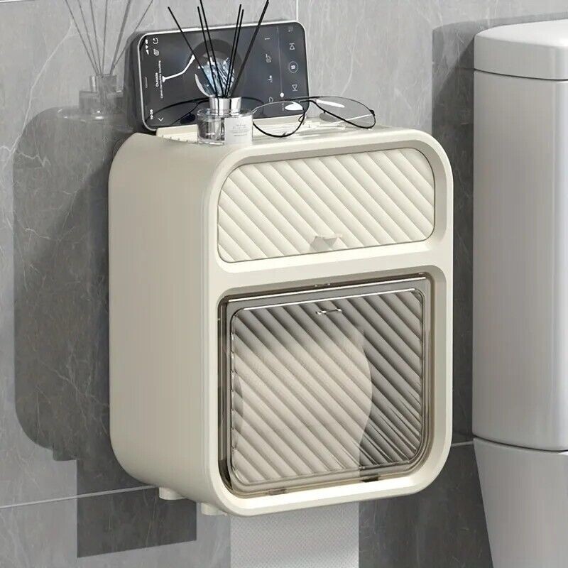 موزع ورق التواليت 3 في 1 يوفر المساحة. الجزء السفلي عبارة عن صندوق مناديل بغطاء POP-UP-LOCK.