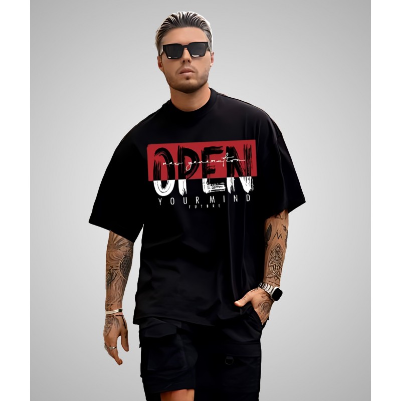 يعمل التصميم الأسود بشكل أساسي كلوحة متعددة الاستخدامات لعناصره الرسومية الجذابة. مع كلمة "OPEN" الجريئة بحروف بيضاء كبيرة على خلفية حمراء نابضة بالحياة، يجذب هذا التي شيرت الانتباه بسهولة. تكمل العبارات الإضافية "YOUR MIND" و "FUTURE" الرسوم البيانية الرئيسية، مما يخلق صورة لافتة للنظر تتناغم مع الثقافة الحضرية الحديثة.