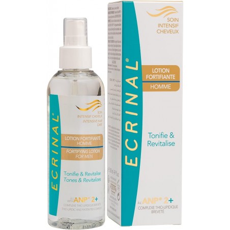تتميز الملصق الجذاب بمزيج أنيق من الألوان الفيروزية والبيضاء والذهبية. يبرز اسم العلامة التجارية ECRINAL بشكل بارز في الأعلى، بينما تشير عبارة "Lotion Fortifiante Homme" بوضوح إلى غرضه كلوشن مقوي مصمم خصيصًا للرجال. تبرز فوائده عبارات مثل "تنشيط وتجديد" التي تؤكد على فعاليته في تعزيز صحة الشعر.