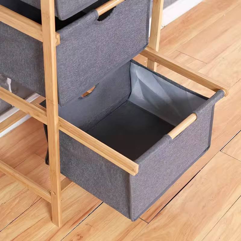 يتناقض اللون الرمادي الناعم للصناديق بشكل جميل مع الإطار الطبيعي من البامبو، مما يخلق جمالية أنيقة وعصرية تتناسب بسلاسة مع أنماط الديكور الداخلي المختلفة مثل الديكور المعاصر، الاسكندنافي، والبوهو. تتضمن كل صندوق مقبض مريح لسهولة الوصول، مما يعزز الوظائف دون المساس بالأناقة.