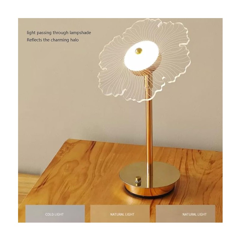 الميزة البارزة في هذا المصباح هي ظله الفريد متعدد الطبقات الذي يشبه زهرة معقدة أو مروحة. أبيض في الأساس مع خطوط رقيقة تخلق ملمسًا رقيقًا، يجذب الانتباه بينما يوفر إضاءة محيطة ناعمة. يحتوي القرص المركزي على زر معدني صغير يعمل كمفتاح تحكم سهل لضبط مستويات السطوع.