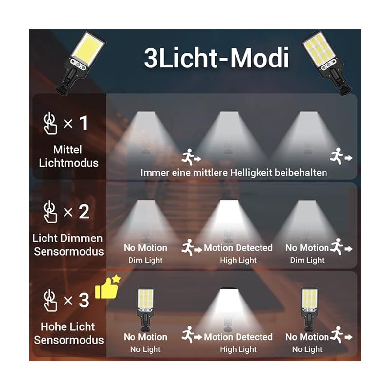 بعد ذلك، لدينا وضع مستشعر تخفيف الإضاءة. هذه الميزة الذكية تنشط عند اكتشاف الحركة، مما يضيء مساحتك بشعاع ساطع من الضوء. عندما لا يحدث أي حركة، يتم تخفيف الإضاءة تلقائيًا للحفاظ على الطاقة مع توفير إضاءة كافية للأمان.