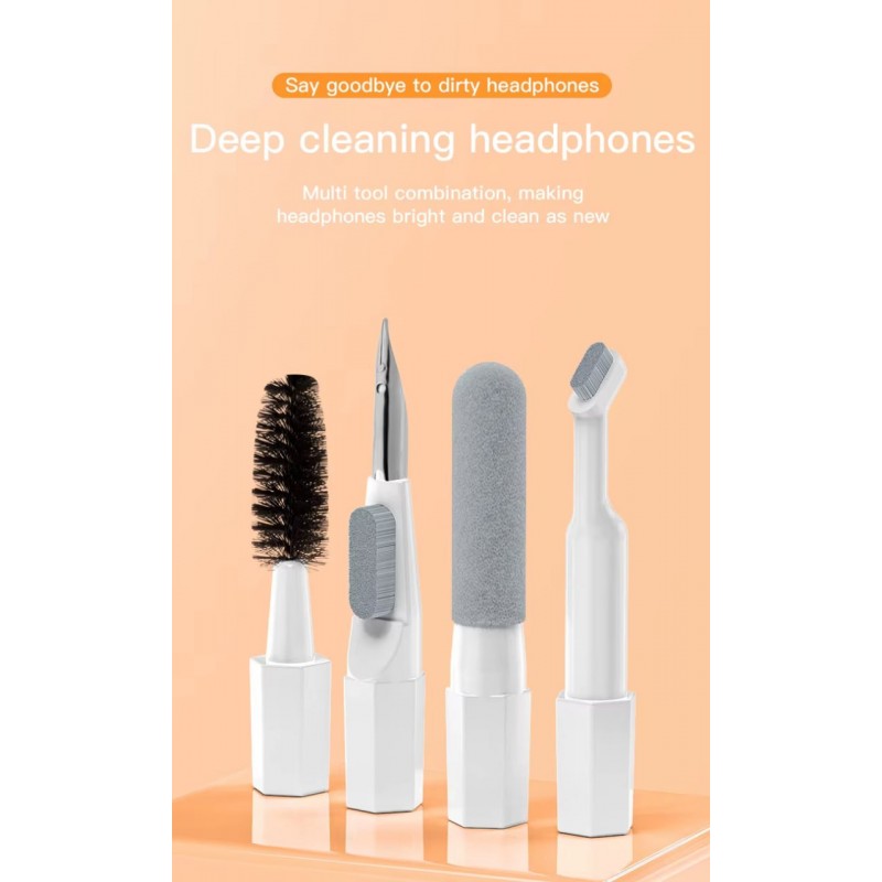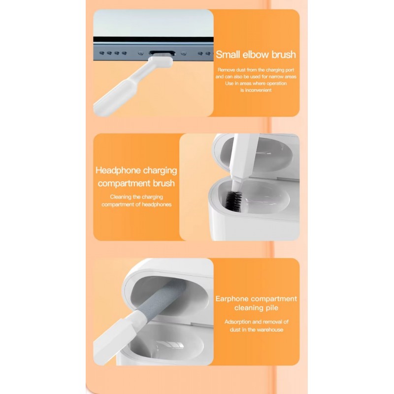 نقدم لكم أدوات تنظيف مبتكرة للأجهزة الإلكترونية، مصممة خصيصًا للحفاظ على سماعات الرأس وأماكن شحنها في حالة ممتازة. تتضمن هذه المجموعة الأساسية ثلاثة فرش متخصصة، كل منها مصمم للتنظيف الفعال.