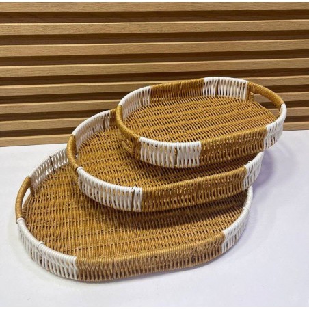 اكتشف مجموعتنا الأنيقة من الصواني البيضاوية المنسوجة، المثالية لتعزيز ديكور منزلك. مصنوعة من الألياف الطبيعية مع تفاصيل بيضاء مذهلة، هذه الصواني متعددة الاستخدامات مثالية للتقديم والتنظيم، أو كقطع زخرفية. تصميمها القابل للتداخل يضمن سهولة التخزين بينما يضيف لمسة من السحر البوهيمي إلى أي مكان.