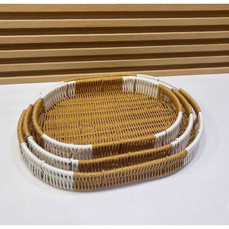 يتيح التصميم الفريد المتداخل تخزينًا سهلاً مع عرض الشكل الأنيق لكل صينية. تشكل أكبر صينية القاعدة، مع اثنتين أصغر تتراكبان بشكل مثالي فوقها. كل صينية مصنوعة من مادة منسوجة متينة، من المحتمل أن تكون من الخيزران أو قصب مشابه، مما يضمن طول العمر والمرونة في الاستخدام اليومي.