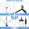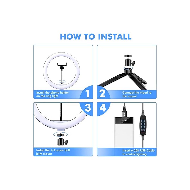 تأتي هذه الحلقة ضوء مزودة باتصال USB مريح، مما يسهل تشغيلها باستخدام الكمبيوتر المحمول أو بنك الطاقة أو محول الحائط. يسمح حامل الهاتف المرفق بالتشغيل بدون استخدام اليدين أثناء التقاط صور مذهلة أو بث محتوى مباشر على منصات وسائل التواصل الاجتماعي.