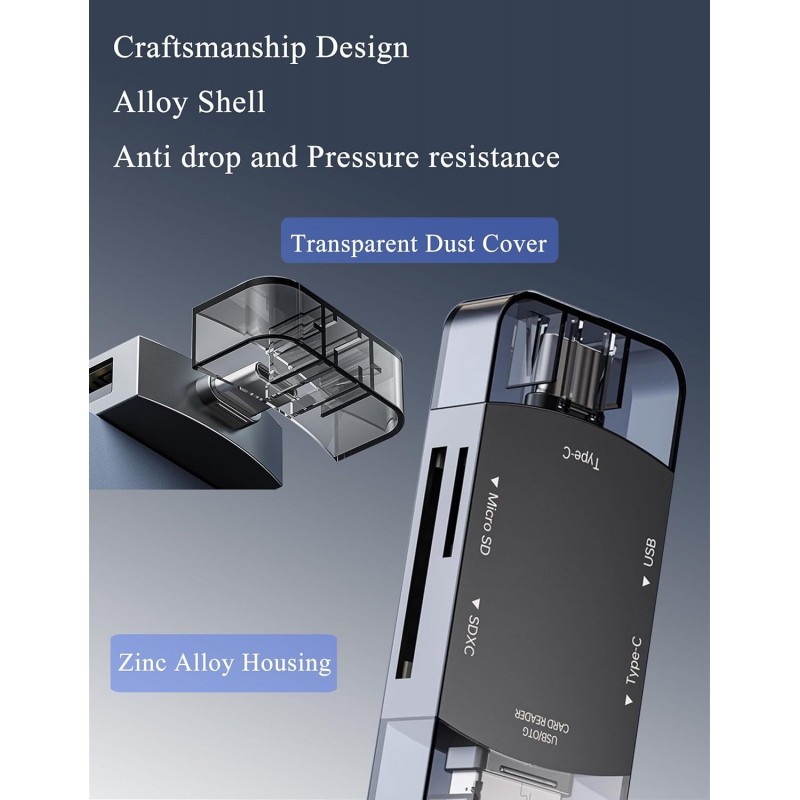 【Four Interfaces Run Simultaneously】This micro sd card reader with 4 ports, SD card solt, TF card solt, USB A interface and Type-C interface. Four ports can be run simultaneously. For example, you can read and run SD cards, TF cards, USB flash disk and Type-C interface portable hard drive simultaneously. This means you can transfer data and expand your computer's capabilities without having to switch between different adapters or cables.