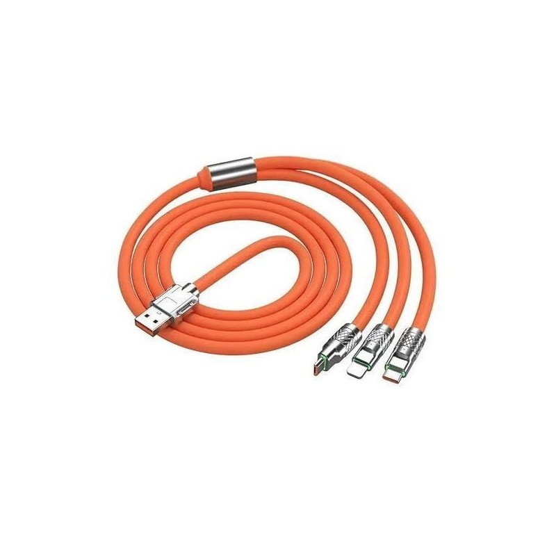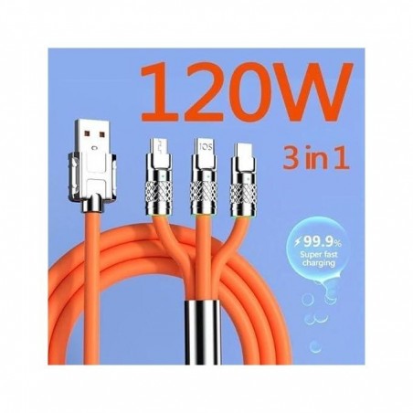 Discover the ultimate 3-in-1 Fast Charging Cable, designed for versatility with USB Type-C, Micro USB, and Lightning connectors. Enjoy rapid charging capabilities of up to 120W, ensuring your devices power up quickly. Made from durable materials and featuring a vibrant orange color, this cable is perfect for users on the go who need reliable performance.