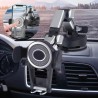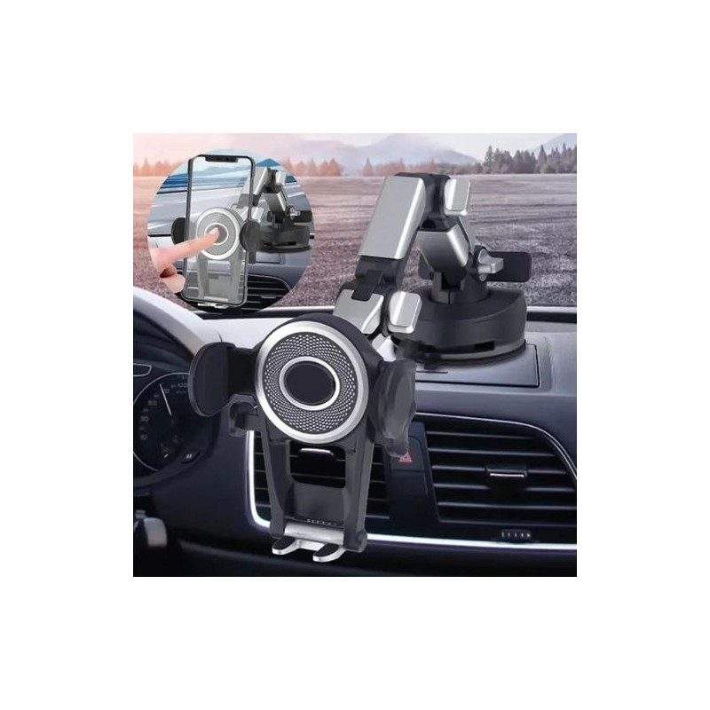 The car phone mount features a robust suction cup base, ensuring a secure attachment to your vehicle's dashboard or console. Its sleek design, available in modern shades of black, silver, and gray, complements any interior while providing durability through high-quality plastic and metallic accents.