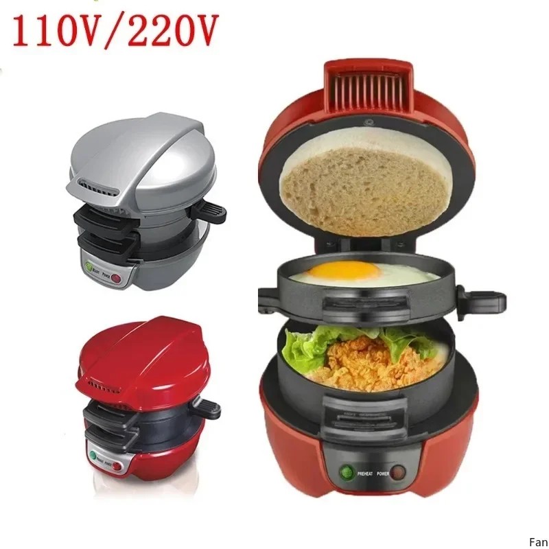 The sandwich maker features a unique dual-layer design, enabling you to cook multiple ingredients simultaneously. With its vibrant red exterior and sleek black cooking surfaces, this device not only performs well but also adds a modern touch to your kitchen decor. Its compact size ensures it fits comfortably on any countertop, making it an ideal choice for those with limited space.