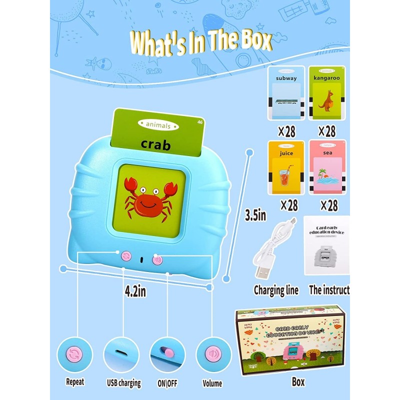 Made from ABS, these cards are odorless and feature a smooth surface that ensures children's safety. The compact device comes in a soft blue color that captures the attention of little ones while providing them with a pleasant tactile experience. Thanks to its built-in screen, children can view colorful illustrations corresponding to the words on each card.