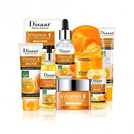 Discover the transformative power of visage à la vitamine C de Disaar. This comprehensive skincare set includes a facial wash, toner, serum, cream, and cleanser, all enriched with Vitamin C and Hyaluronic Acid. Designed to brighten your complexion while providing deep hydration and anti-acne benefits, it's perfect for daily use to achieve radiant skin.