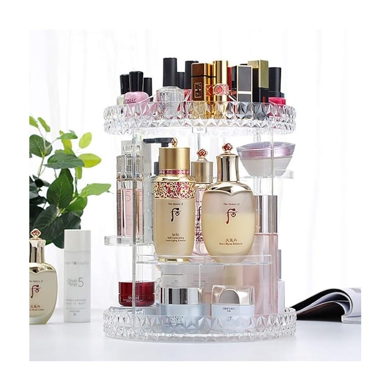 Discover the adjustable 360-degree rotating multifunctional makeup organizer made of acrylic, designed to optimize your beauty space. Made from durable acrylic, it provides easy access to your cosmetics with its rotating mechanism. With its adjustable levels and large capacity, this organizer is perfect for storing makeup, skincare, and accessories.