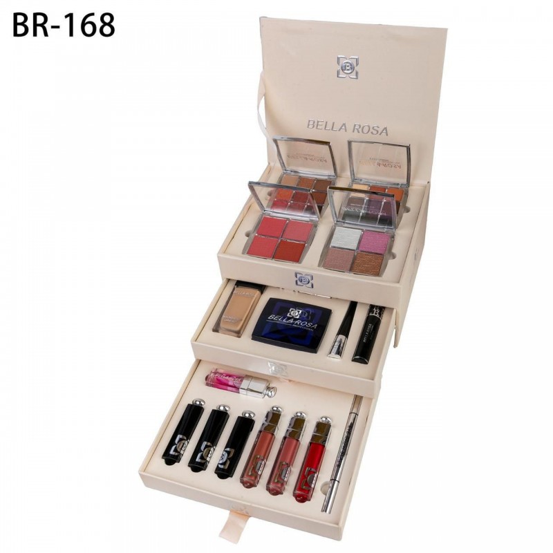 Discover the elegance of the Bella Rosa BR-168 cosmetics collection. This sophisticated set features a cream-colored case with multiple compartments, housing an array of makeup essentials including lip colors, eyeshadows, and a compact foundation. Perfect for makeup enthusiasts, it offers versatility for any occasion while ensuring easy transport and organization.