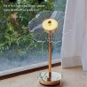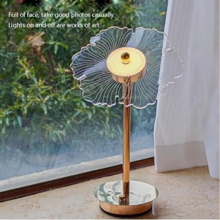 The standout feature of this lamp is its unique layered shade that resembles an intricate flower or fan. Primarily white with delicate lines creating a feathery texture, it captures attention while providing soft ambient lighting. The central disk houses a small metallic button that serves as an easy control switch for adjusting brightness levels.