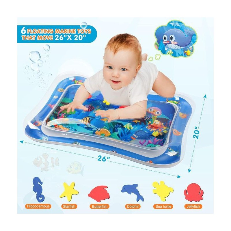 Constructed from durable plastic material, likely PVC, this inflatable mat is both water-resistant and easy to clean. The air chambers allow for quick inflation, providing a cushioned feel that enhances comfort during tummy time activities. As babies lie on the mat filled with water, they can enjoy a unique sensory experience while floating toys within the vibrant aquatic scene.