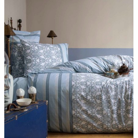 Transform your bedroom into a serene sanctuary with our exquisite bedding set. This collection features a soothing color palette of light blue, white, and subtle gray tones, perfect for creating a calming atmosphere. The duvet cover and pillowcases showcase intricate floral and geometric designs in darker blue hues, providing a striking contrast that enhances the overall aesthetic.