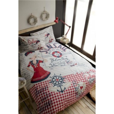 The centerpiece of this set is the exquisite duvet cover, showcasing an enchanting design that includes illustrations of a sailor girl in a striking red dress holding a rope. The backdrop is adorned with nautical elements such as lifebuoys and anchors, complemented by whimsical text like "Sailing Love" and "Calm Sea." Crafted from soft and durable fabric—likely cotton or a cotton blend—this duvet cover not only offers comfort but also adds aesthetic appeal to your bedroom.