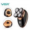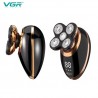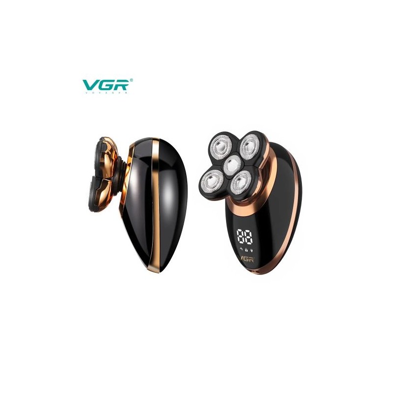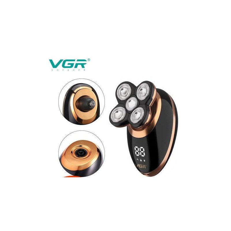 The shaver boasts a modern design with a glossy black finish complemented by elegant gold accents. Its innovative shaving head is equipped with five circular elements arranged in a unique pattern, ensuring a close and efficient shave while adapting to the contours of your face.