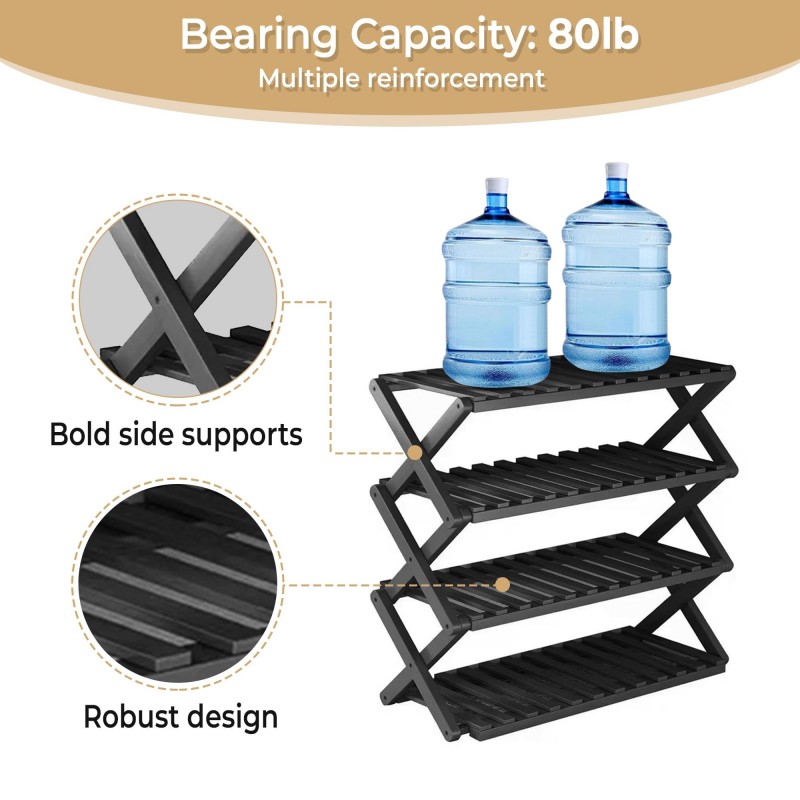 The four-tiered design provides ample storage, allowing you to neatly arrange multiple pairs of shoes—from casual sneakers to elegant boots. Each tier features slatted shelves that promote air circulation, ensuring your shoes remain fresh and well-ventilated. The compact dimensions make it suitable for various indoor environments such as entryways, closets, or mudrooms.