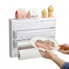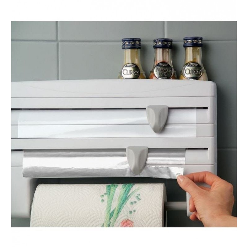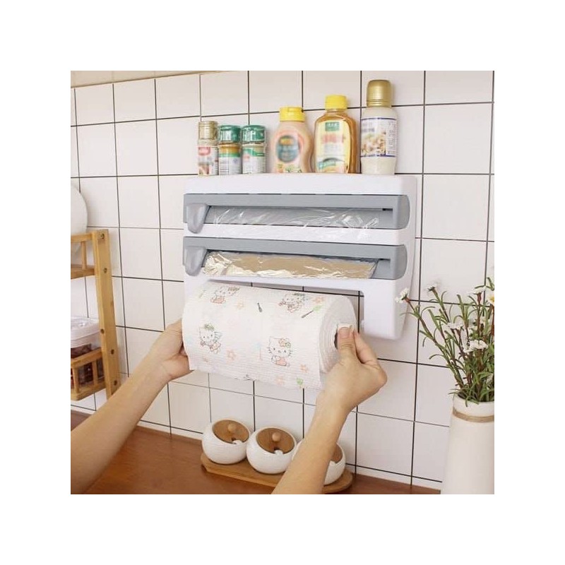 This multifunctional holder is equipped with a plastic wrap dispenser, allowing easy and quick access to your plastic wrap. With its integrated cutter, you can cut the wrap precisely, ensuring clean edges for optimal use. The lower section also serves as a paper towel roll holder, making this accessory even more practical during food preparation.