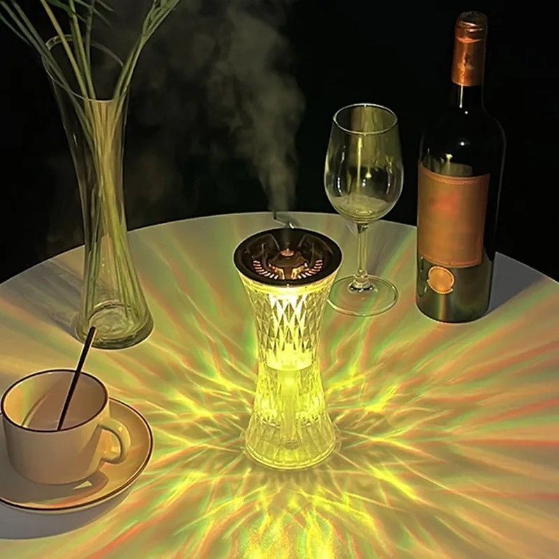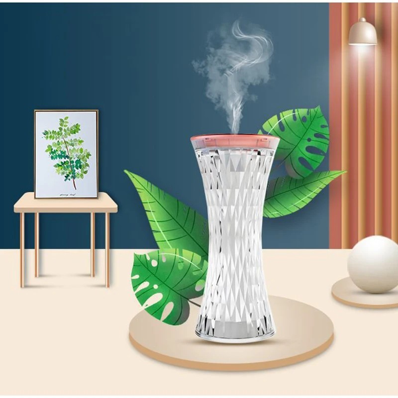 The sleek design of the Humidificateur Luminox showcases an elegant cylindrical shape, crafted from high-quality materials. The upper section boasts a luxurious rose gold finish, while the lower part is made from clear textured glass with a stunning diamond-cut pattern. This unique combination enhances its aesthetic appeal and ensures it fits seamlessly into various interior styles.