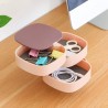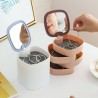 The left container boasts a sleek white finish, characterized by its rounded edges and compact design, making it an ideal addition to any tabletop. Its durable plastic construction ensures longevity, while the attached square mirror with rounded corners provides a convenient way to check your look before heading out. Inside, the soft dark fabric lining protects your precious items from scratches, ensuring they remain in pristine condition.