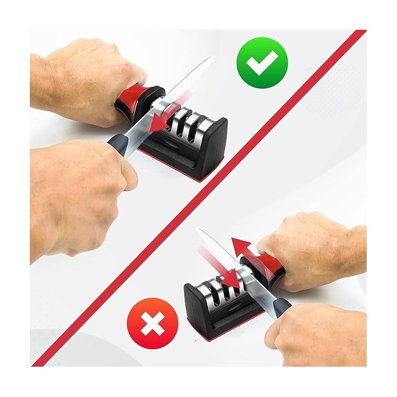 The knife sharpener adopts ABS plastic body and tungsten steel blade groove, high hardness ceramic, which is durable and always looks good and used like new. Unlike sharpening stones, manual sharpeners last longer and can withstand the stress of sharpening. The professional knife sharpener is equipped with 4 grooves to help repair blunt knives with different levels of blade wear. Choose from coarse, fine, fine and scissor grooves to repair blunt blades and restore them to their factory edge in a few simple steps.