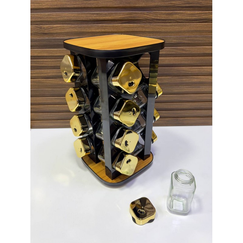 An additional jar placed beside the main unit showcases its expandable nature—perfect for those who want even more storage options without compromising on style. With its contemporary color scheme of black and gold combined with transparent glass elements, this spice rack is not just practical; it's also a decorative piece that elevates any kitchen or dining area.