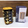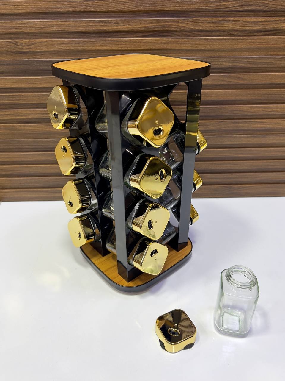 This versatile storage solution holds up to 12 glass jars, arranged in an innovative spiral format around the central axis. Each hexagonal jar features rounded edges for easy handling and is made from clear glass, allowing you to see the vibrant colors of your spices or herbs at a glance. The shiny gold lids not only add elegance but also include small dispensing holes for convenient access when cooking.