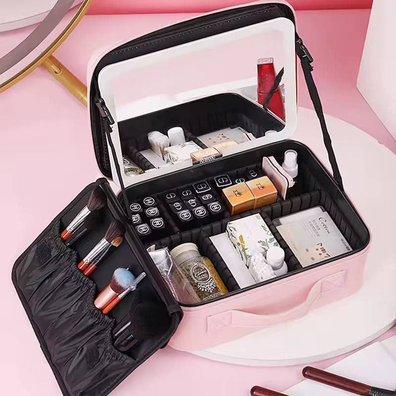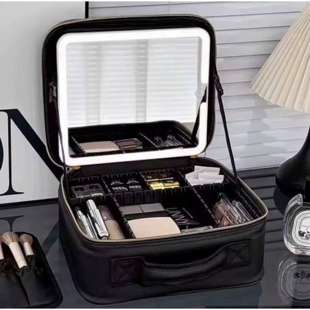 Discover the ultimate makeup organizer case, designed for style and functionality. Its sleek black exterior, durable material, and illuminated mirror enhance your makeup application experience. With multiple compartments for efficient storage of cosmetics, this versatile case is perfect for both professionals and personal use. Keep your beauty essentials organized and accessible wherever you go!
