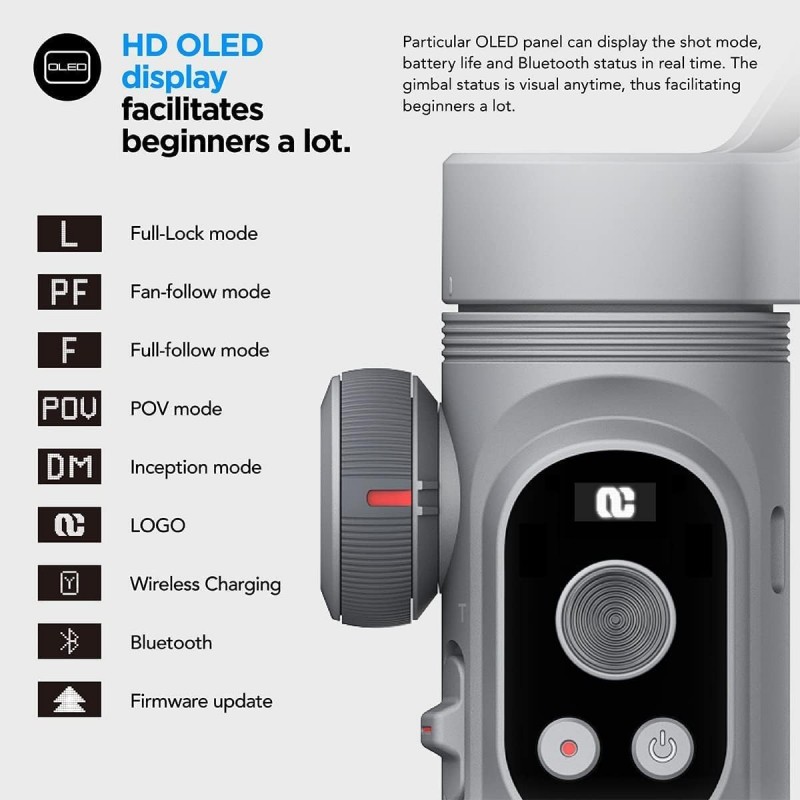 Professional Smartphone Gimbal Stabilizer, Wireless Charging, OLED Display, LED Light, Focus Wheel