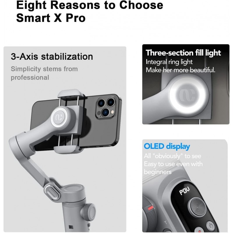 310g ultralight design with HD OLED display: The ultralight body can be easily held in one hand. Plus, thanks to its foldable design, the X Pro takes up little space in the pocket of your backpack or overcoat. Light pack travel becomes possible for outdoor photography; A particular OLED panel can display shooting mode, battery life and Bluetooth status in real time, the status of the gimbal is visual at any time, making it much easier for beginners.