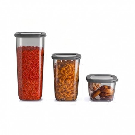 Discover our versatile set of three food storage containers, designed for optimal pantry organization. With a transparent body and modern gray lids, these containers are perfect for storing dry goods like lentils and pasta. Their sleek design not only enhances your kitchen aesthetics but also ensures easy access and freshness, making them an essential addition to your home.
