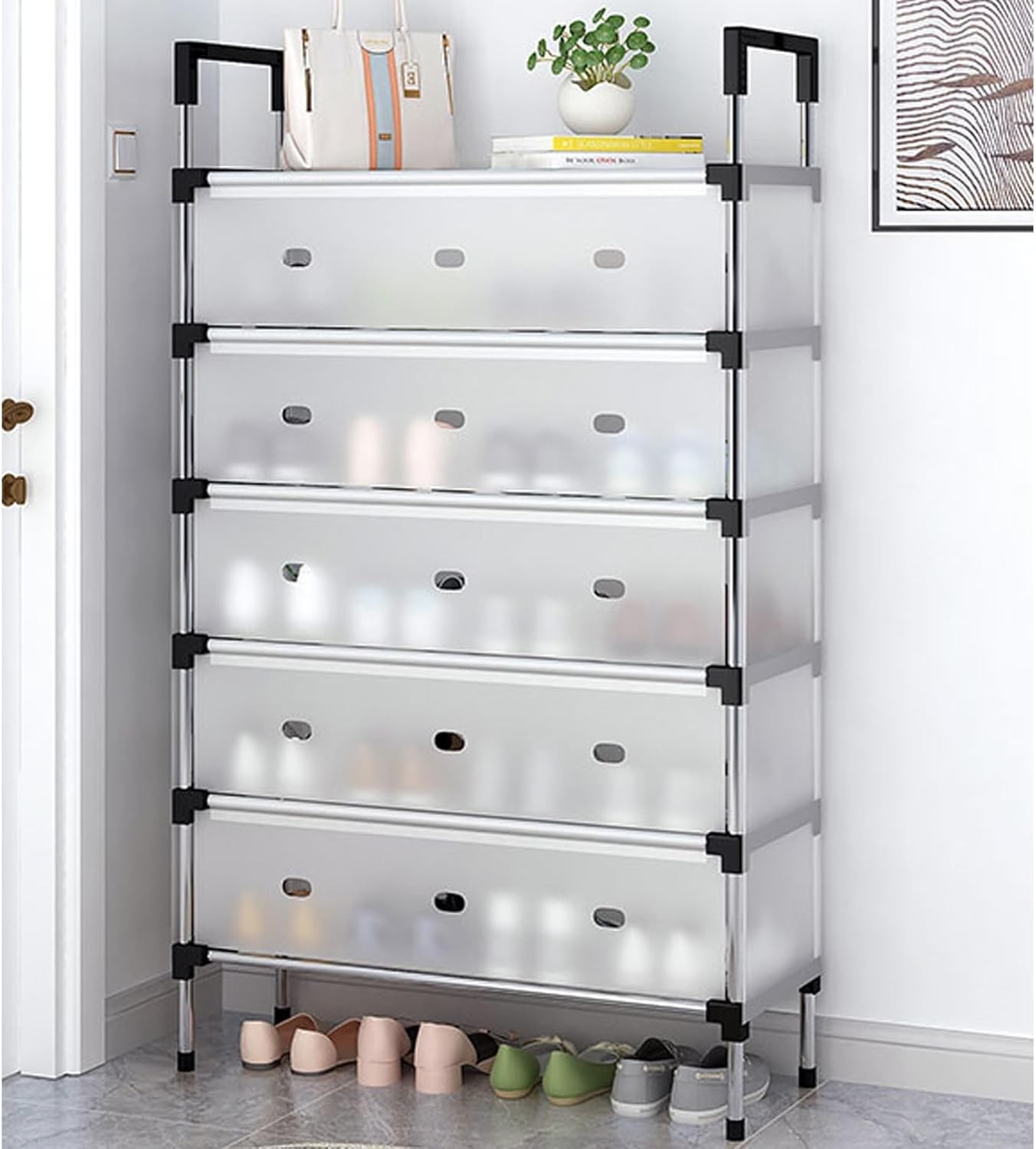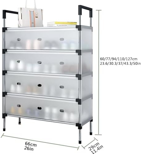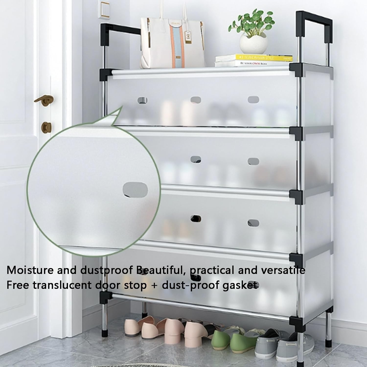 The tiered structure features four horizontal compartments that can accommodate multiple pairs of shoes, from casual sneakers to elegant heels. Crafted with a sturdy metal frame, the GLFNB Hidden Shoe Cabinet combines durability with a sleek aesthetic that complements any decor style. The shelves are made from a translucent material that not only adds a modern touch but also allows you to see your shoes at a glance.
