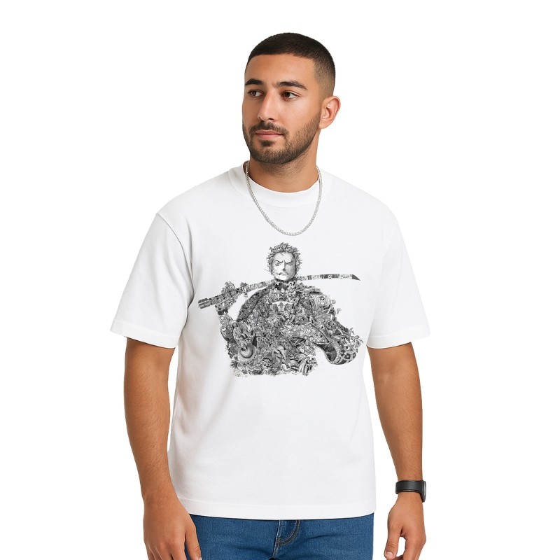 La caractéristique remarquable de cette chemise est son design graphique saisissant. L'avant met en avant une illustration complexe d'une figure tenant une épée, entourée de motifs détaillés qui reflètent une touche artistique. La palette monochrome de noir et de gris crée un contraste audacieux avec le tissu blanc, garantissant que vous fassiez sensation où que vous alliez.