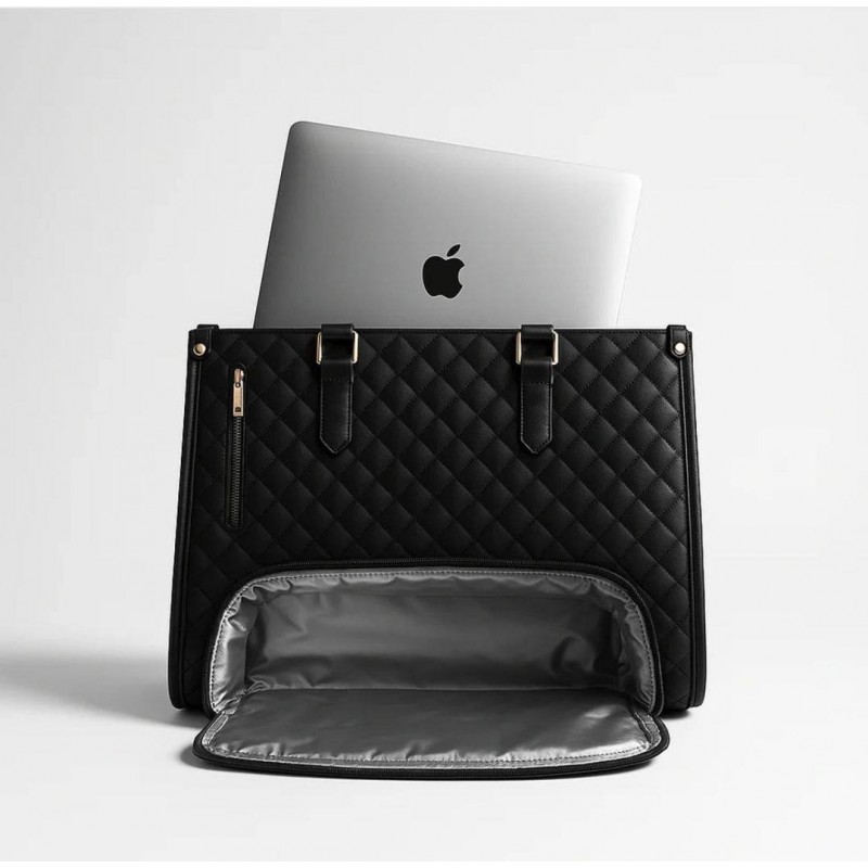 La couleur noire sophistiquée assure une polyvalence, la rendant adaptée à divers environnements, que vous vous rendiez au bureau ou assistiez à une réunion décontractée. À l'intérieur, vous trouverez un compartiment spacieux doublé d'un matériau argenté métallique frappant, conçu pour un nettoyage facile tout en protégeant votre ordinateur portable des rayures.