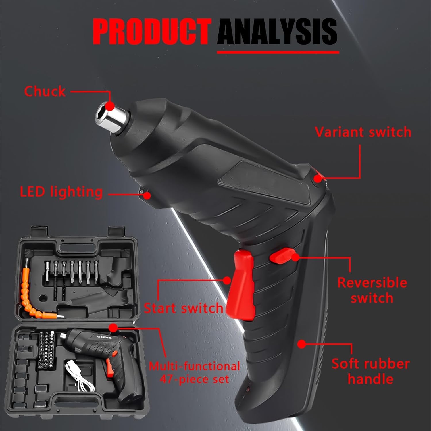Cette visseuse électrique se distingue par sa capacité à s'adapter à divers types de travaux grâce à ses 47 accessoires inclus. Que vous assembliez des meubles ou réalisiez des réparations légères, cet outil polyvalent répondra à tous vos besoins. De plus, son système de charge USB vous garantit une recharge rapide et pratique, éliminant le besoin d'adaptateurs encombrants.