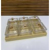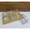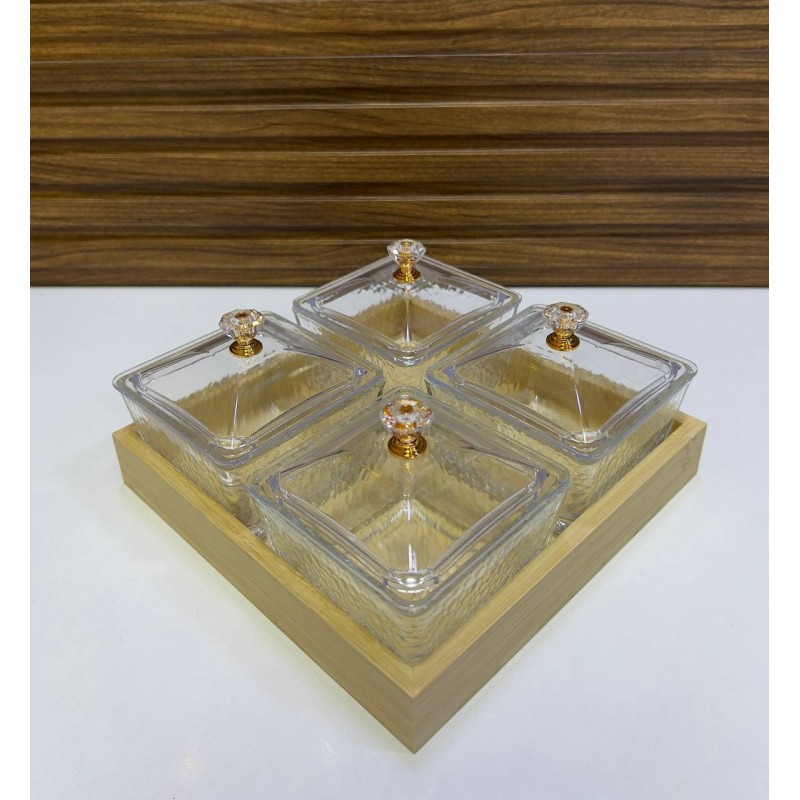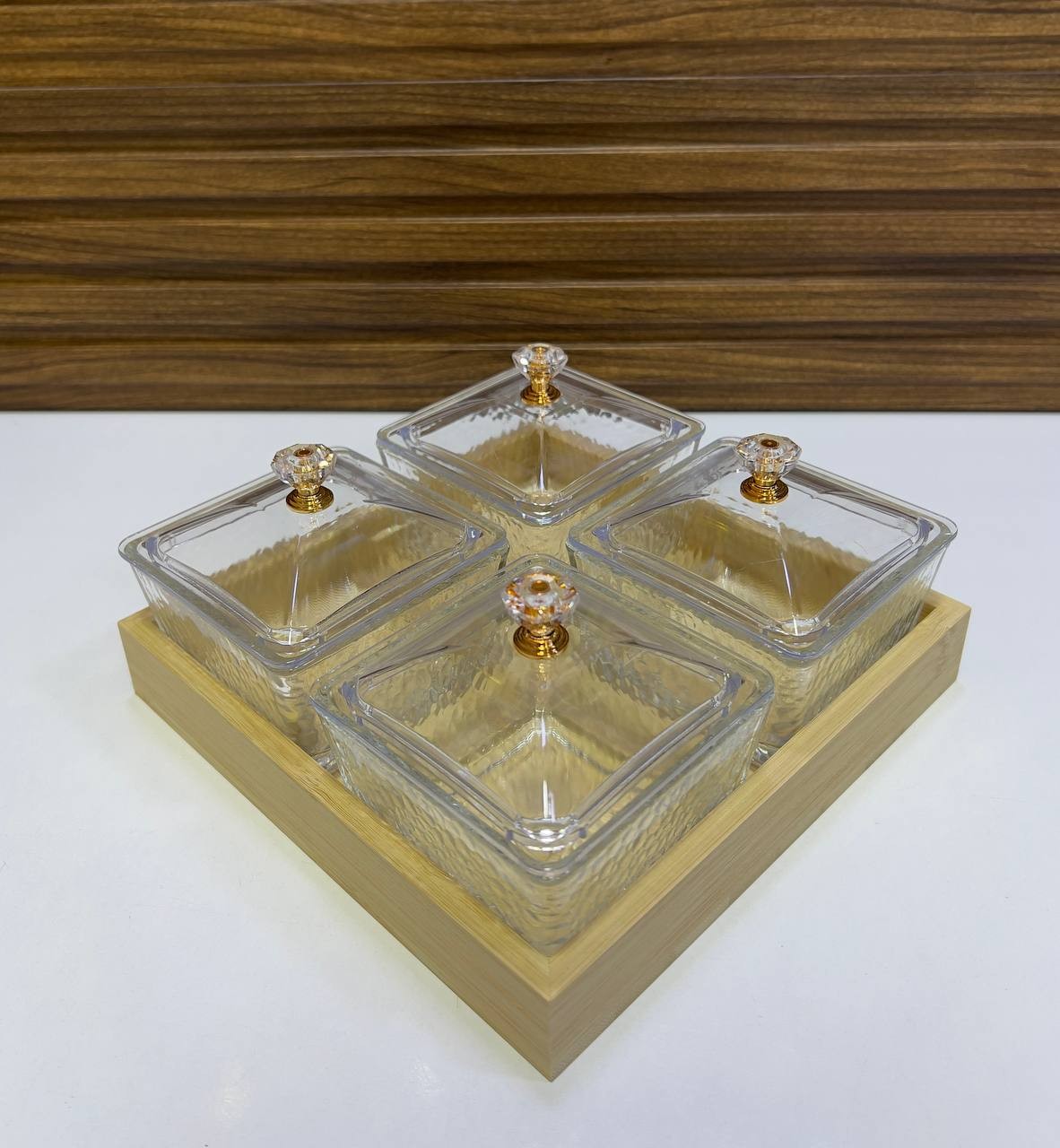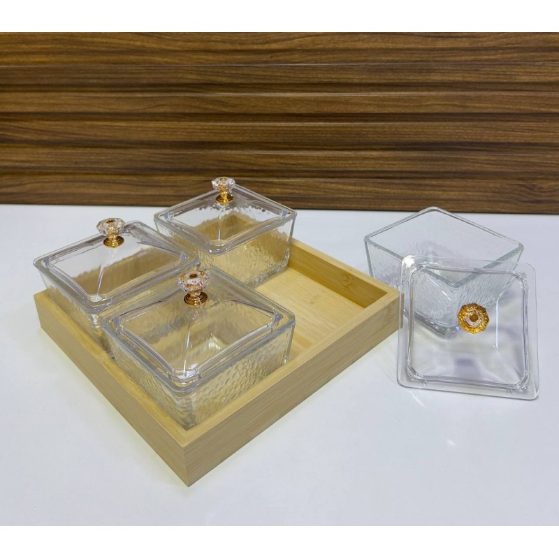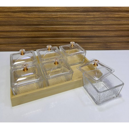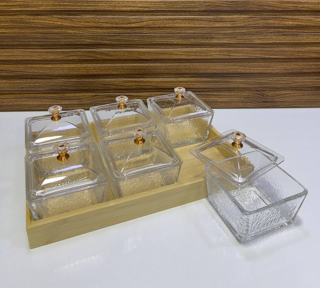 Découvrez notre élégant ensemble de six conteneurs de stockage en verre, parfaits pour organiser les épices, les produits de base du garde-manger ou les objets décoratifs. Chaque conteneur présente un design carré élégant avec une finition transparente et des boutons dorés ornés sur les couvercles. Disposés sur un plateau en bambou stylé, ces conteneurs modernes allient fonctionnalité et sophistication, améliorant votre décoration intérieure sans effort.