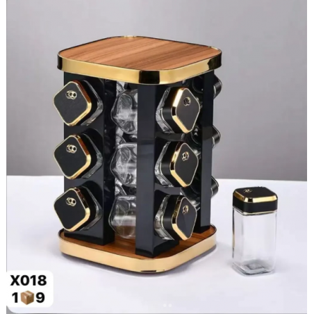 Un bocal supplémentaire placé à côté de l'unité principale met en avant sa nature extensible—parfait pour ceux qui souhaitent encore plus d'options de rangement sans compromettre le style. Avec son schéma de couleurs contemporain noir et or associé à des éléments en verre transparent, cette étagère à épices n'est pas seulement pratique ; c'est aussi une pièce décorative qui élève toute cuisine ou salle à manger.