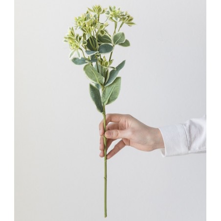 Le haut de la tige met en valeur de petites fleurs densément regroupées dans des teintes vibrantes de vert avec des nuances subtiles de jaune ou de crème. Les pétales sont délicatement dentelés, ajoutant une touche de réalisme qui ne manquera pas d'impressionner. Complétant ces éléments floraux, des feuilles allongées en forme d'ovale dans des tons variés de vert foncé et clair. Chaque feuille est légèrement texturée et certaines présentent des variations, mettant en valeur un beau mélange qui renforce son apparence réaliste.