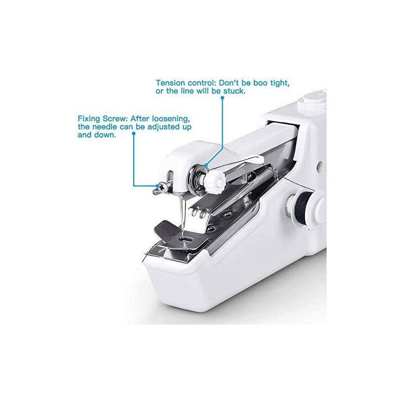 Cet appareil est équipé d'un mécanisme simple d'utilisation : un bouton d'activation et un cadran latéral permettent d'ajuster la tension ou la longueur des points selon vos besoins spécifiques. La présence d'une aiguille métallique bien positionnée assure des coutures précises sur divers types de tissus.