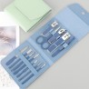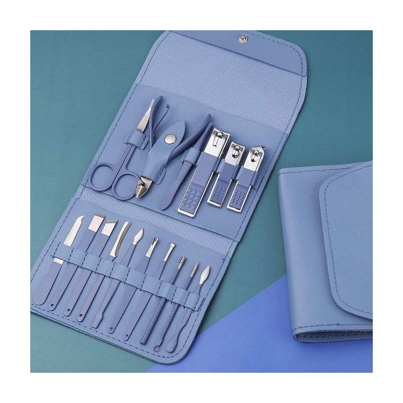 Tous ces outils sont soigneusement organisés dans un élégant étui bleu clair en cuir synthétique. Ce design pliable comprend des bandes élastiques qui maintiennent tout en place pendant le transport. Que vous soyez à la maison ou en déplacement, ce kit compact garantit que vous avez tous les instruments nécessaires à portée de main.