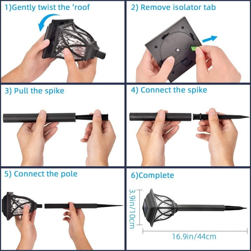 Le design innovant présente un abat-jour décoratif qui ressemble à une lanterne classique, permettant à la lumière de se disperser magnifiquement sur votre pelouse ou votre patio. Avec une longueur d'environ 34,5 cm et un diamètre de 5,6 cm, ces lumières sont parfaitement dimensionnées pour une installation facile dans n'importe quel cadre extérieur. Il suffit de les insérer dans le sol sans avoir besoin de câblage compliqué ou de sources d'alimentation.