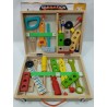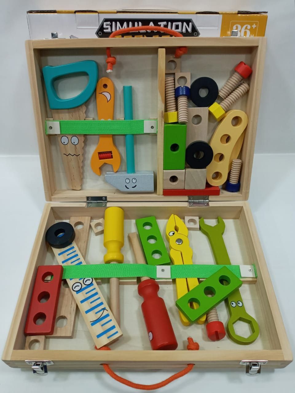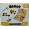 La boîte à outils présente une forme rectangulaire compacte avec un couvercle articulé qui s'ouvre pour révéler un assortiment d'outils en bois colorés et de composants de construction. Fabriqué en bois durable, chaque pièce est poncée pour plus de sécurité et de confort. La palette de couleurs vives—comprenant des nuances de rouge, jaune, vert, bleu et bois naturel—attire l'attention des enfants tout en garantissant un jeu non toxique.