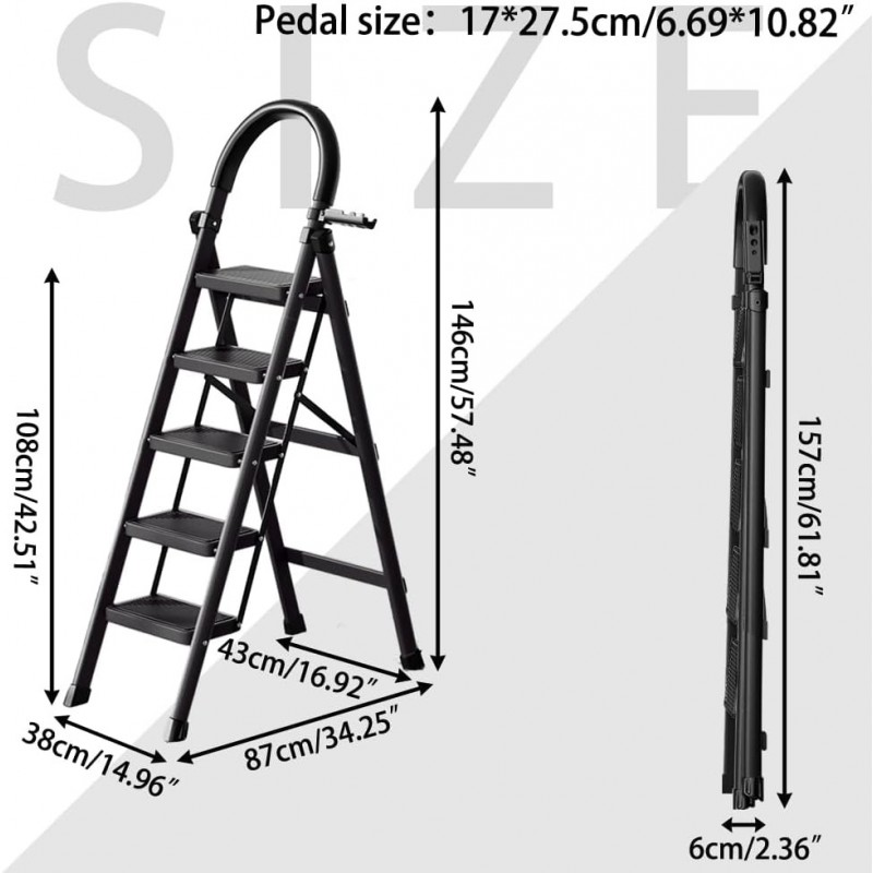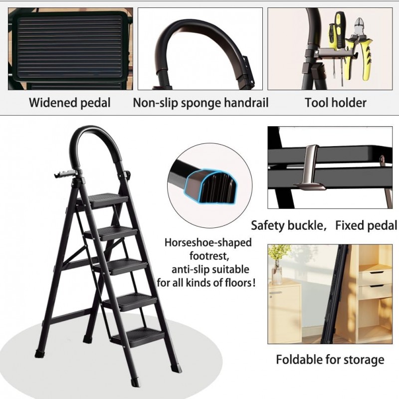 Cette échelle pliante dispose de cinq marches larges et texturées qui offrent un maintien sécurisé, réduisant considérablement le risque de glissade pendant son utilisation. La main courante intégrée améliore la sécurité en fournissant un soutien supplémentaire lors de la montée ou de la descente, ce qui en fait un choix idéal pour atteindre des étagères hautes ou suspendre des objets dans votre maison.