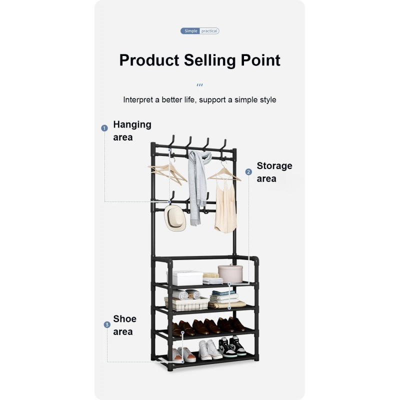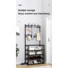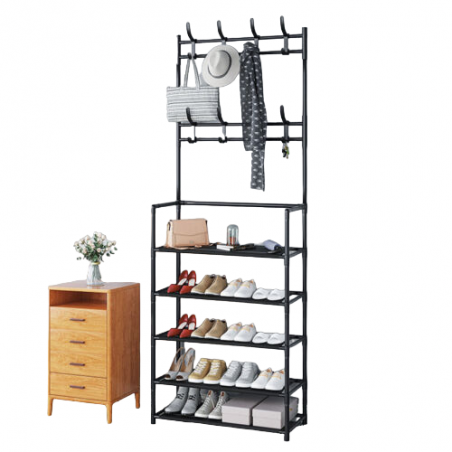 En dessous des crochets se trouve une étagère intégrée qui dispose de cinq étagères ouvertes spécifiquement conçues pour le rangement des chaussures. Ce design en étagères vous permet d'afficher et d'accéder facilement à divers styles de chaussures, des sandales décontractées aux talons élégants, les gardant organisées et hors du sol.